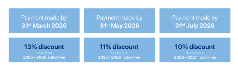 An Early Payment Discount is offered to families who pay their 2025/2026 annual tuition fees in full: