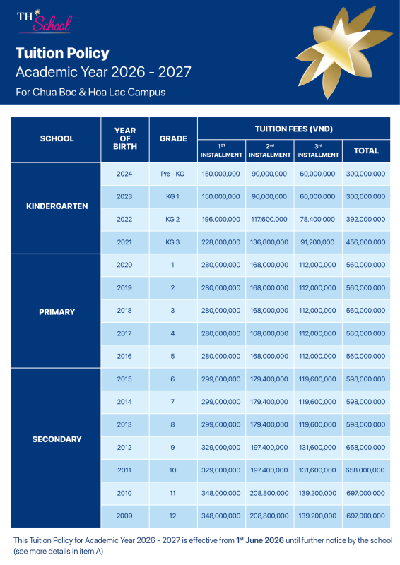 A non – refundable enrollment fee of 8,000,000 VND is payable when the Letter of Acceptance is accepted by parents to guarantee the place for the student. The enrollment fee is paid only once.