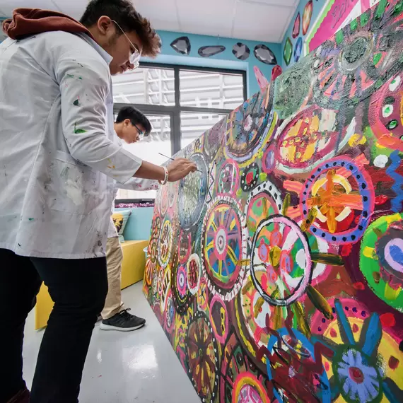 Mr. John has worked with students in Years 6, 7, 10, 11 and 12 to produce a colourful and heavily-patterned large-scale painting, titled "Where Souls Soar in the Air Above Water." This week, two panels were installed in the canteen and one panel instal
