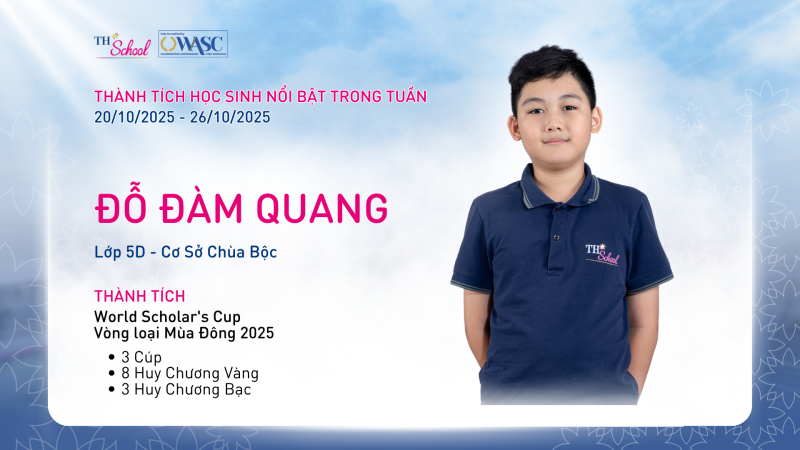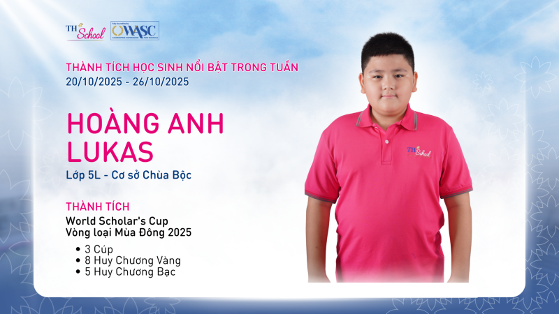 Cứ mỗi tuần qua đi, TH school lại ghi nhận thêm những thành tích, những cố gắng và nỗ lực của các bạn học sinh. Tuần vừa qua là một tuần bùng nổ đáng tự hào khi học sinh TH đã thật sự tỏa sáng tại đấu trường học thuật quốc tế và đã xuất sắc mang vinh quang về cho trường. Hãy cùng điểm qua 1 số những cá nhân nổi bật đáng được chú ý tuần qua.