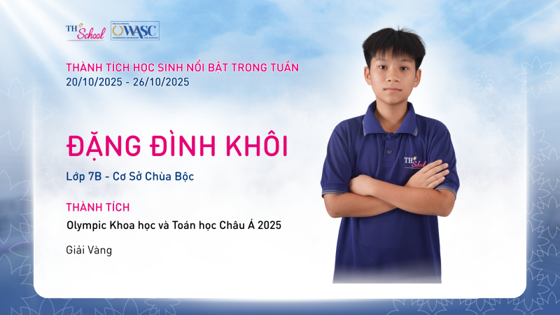 Tuần qua, Đặng Đình Khôi (lớp 7B) đã làm rạng danh TH School khi xuất sắc giành Huy chương Vàng ở Kỳ thi Olympic Toán và Khoa học châu Á (ASMO) 2025. Asian Science and Maths Olympiad (ASMO) là kỳ thi uy tín nhằm tìm kiếm và vinh danh những học sinh có tư duy xuất sắc trong lĩnh vực Khoa học và Toán học trên toàn châu Á.