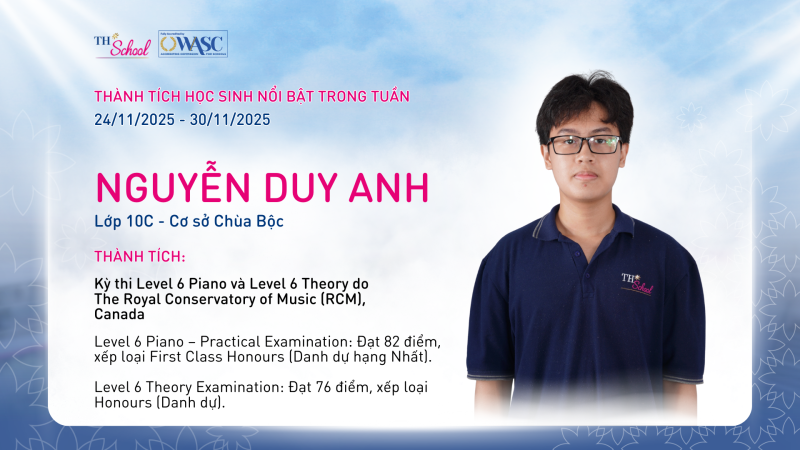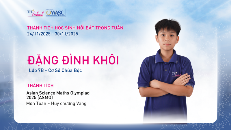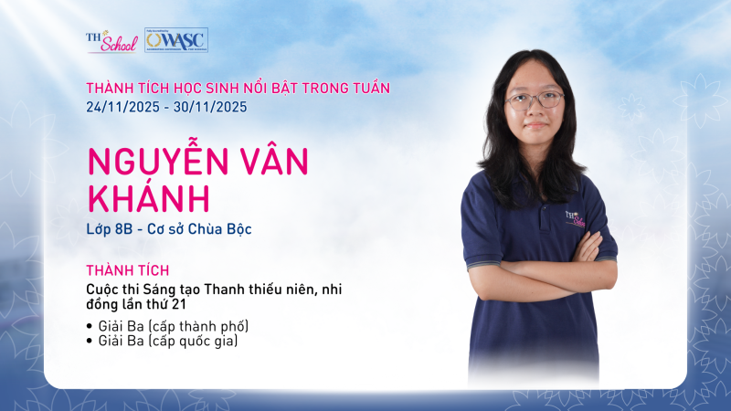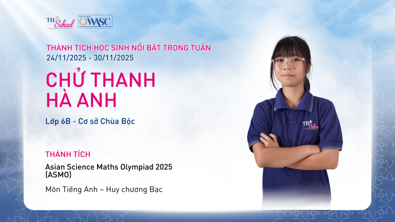Mang dấu ấn của sự cống hiến và tri ân, tháng 11 là dịp để cộng đồng trường TH School cùng nhìn lại và trân trọng những giá trị nhân văn sâu sắc. Trong không khí đặc biệt này, mỗi nỗ lực và từng khoảnh khắc trưởng thành của các em học sinh càng thêm quý giá. Nhà trường tự hào vinh danh 4 em học sinh đã đạt được những thành tích ấn tượng, minh chứng cho tinh thần chủ động và khát vọng kiến tạo giá trị của các em.