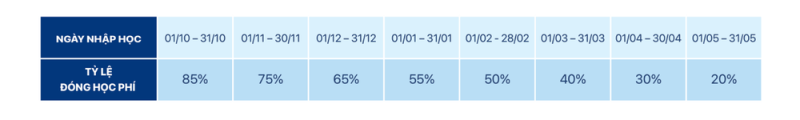 Phụ huynh cần thông báo bằng văn bản cho Nhà trường ít nhất 60 ngày trước ngày học sinh chính thức thôi học. Việc hoàn trả học phí chỉ được áp dụng khi học phí năm đã được thanh toán đầy đủ và phụ huynh đã thực hiện đúng thời hạn thông báo nêu trên. Trong trường hợp đó, Nhà trường sẽ hoàn trả một phần học phí theo tỷ lệ tương ứng với thời điểm thôi học, cụ thể như sau: