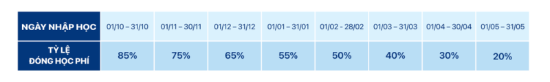 * Nhập học vào Kỳ 3: 30% học phí nguyên năm