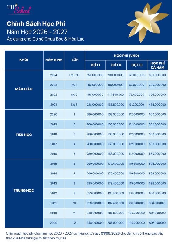 Phụ huynh phải thanh toán tất cả các khoản học phí thích hợp trước khi học sinh nhập học. Phụ huynh có trách nhiệm cho tất cả các khoản thanh toán. Các khoản thanh toán không thể được ủy thác cho bên thứ hai. TH School sẽ xuất tất cả các hóa đơn bằng VNĐ. Tất cả học phí phải được thanh toán bằng VNĐ. Ngoại tệ có thể được chấp nhận đối với phí thanh toán từ các nguồn nước ngoài. Đối với các khoản thanh toán tại nước ngoài, phí sẽ tính theo tỷ giá hiện hành do Vietcombank công bố tại thời điểm thanh toán.