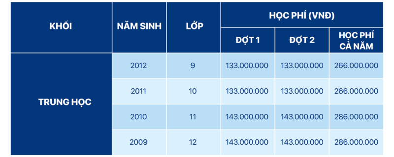 - Phí ăn trưa đóng cùng thời điểm với học phí: 9.000.000 VNĐ/năm hoặc 4.500.000 VNĐ/kỳ